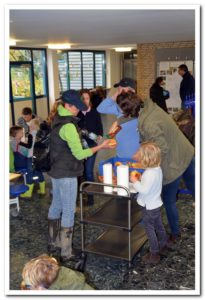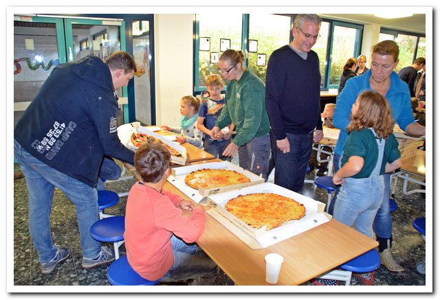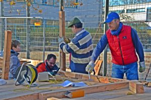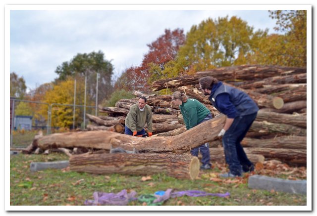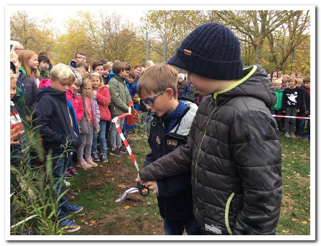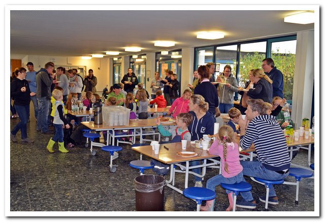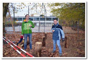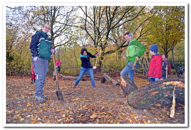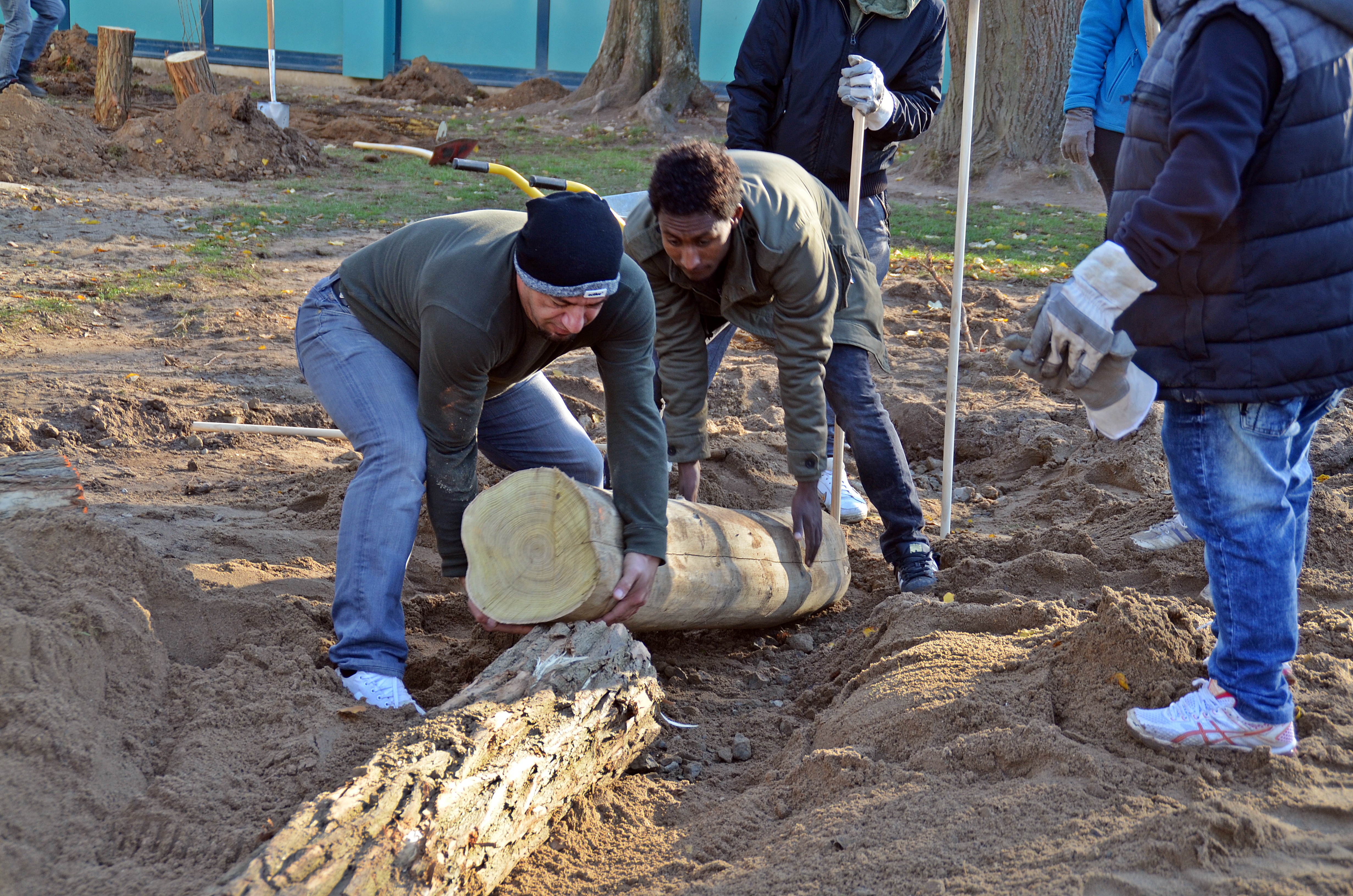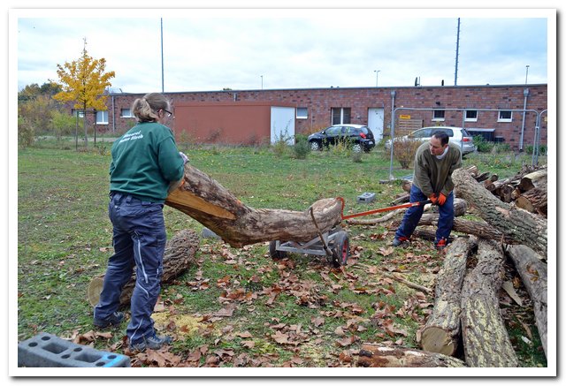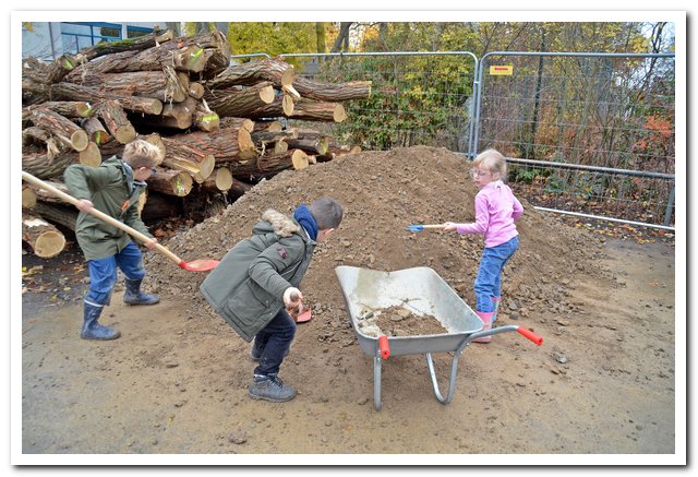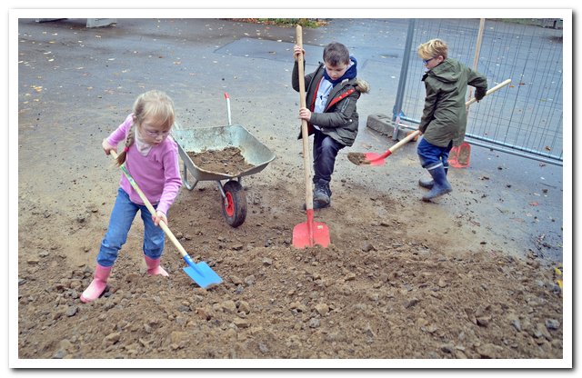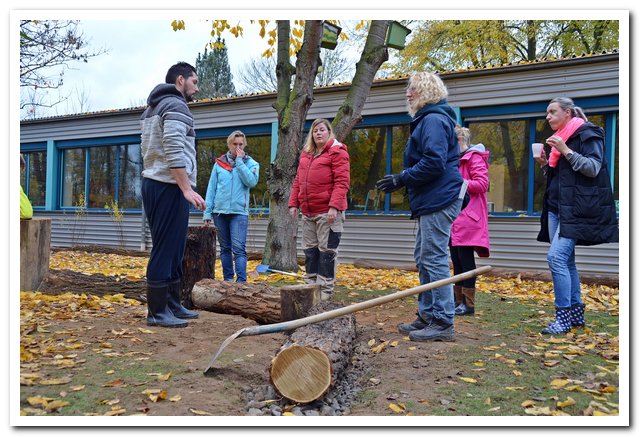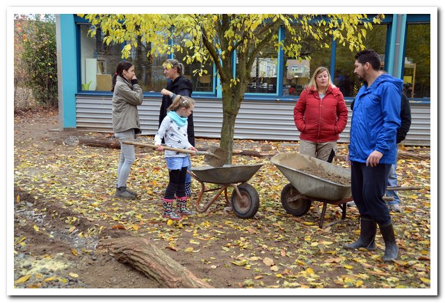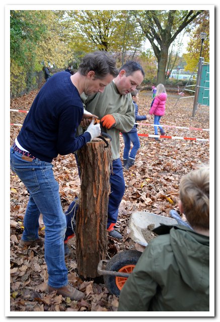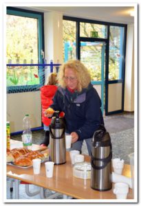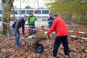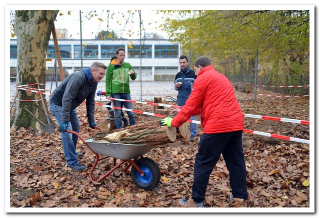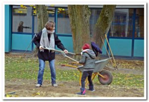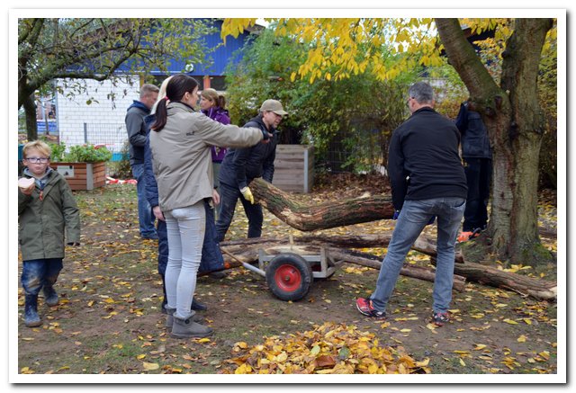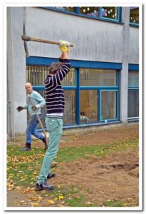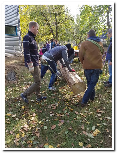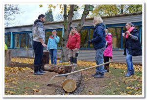 Insgesamt haben ca. 100 Menschen geholfen, unseren Schulhof umzugestalten. Unter Anleitung von Frau Feldhaus wurde gesägt und gehobelt. Wunderschöne Bänke sind entstanden, Baumstämme wurden auf dem Schulhof verteilt. Sträucher wurden gepflanzt und Beete vorbereitet. Insgesamt wurden 10 Tonnen Kalksteinschotter bewegt, Erde wurde abtransportiert und vieles mehr. Berge an belegten Brötchen, Brötchen mit Würstchen, Waffeln, Keksen und anderen Süßigkeiten sowie Äpfeln und Mandarinen wurden verputzt.