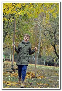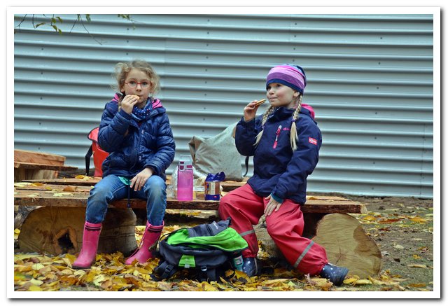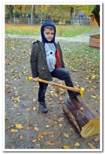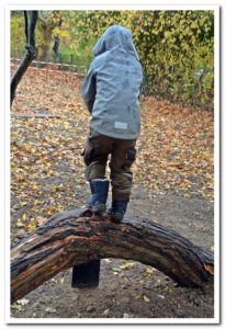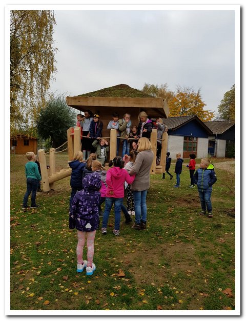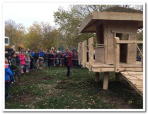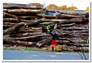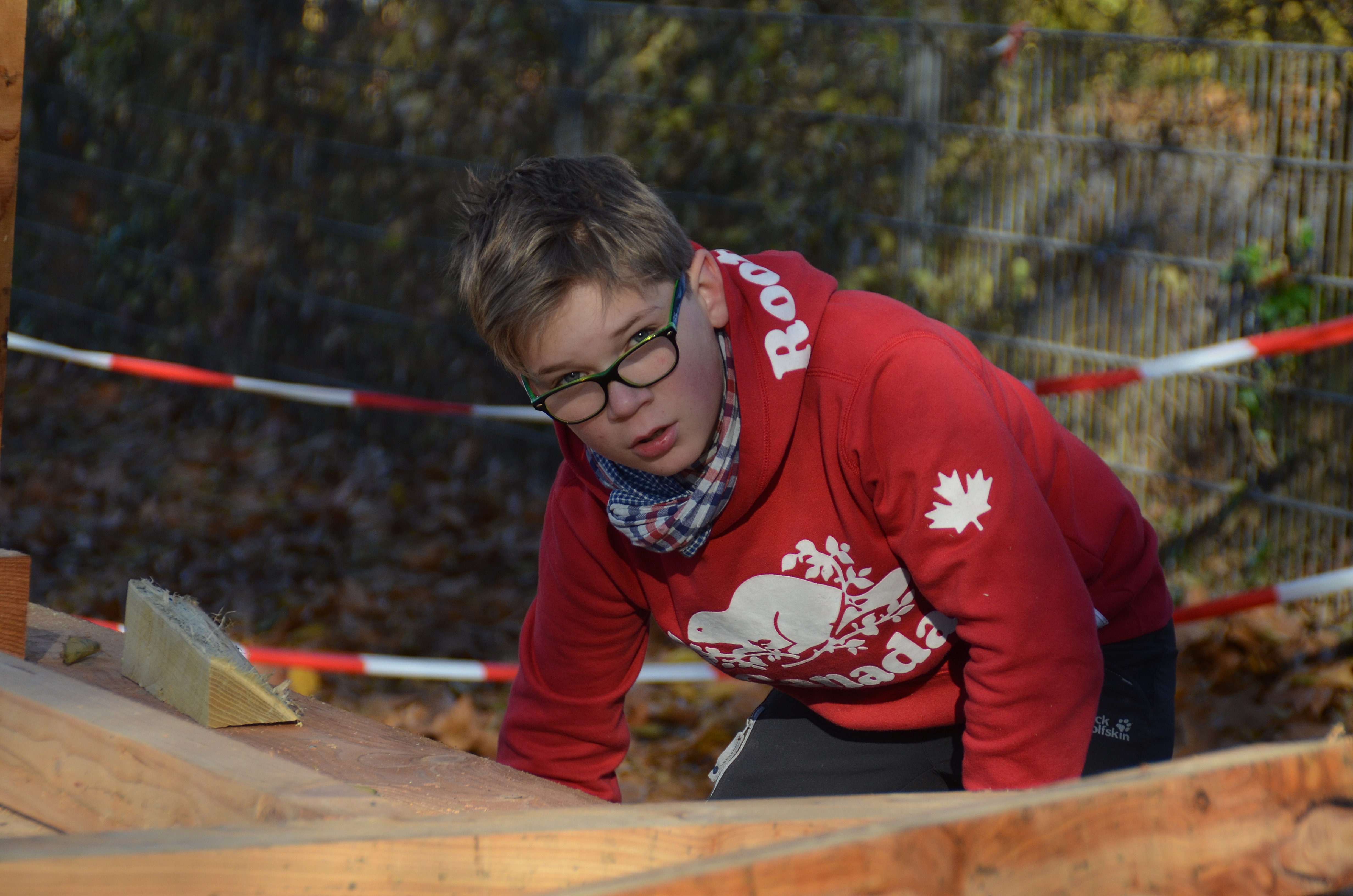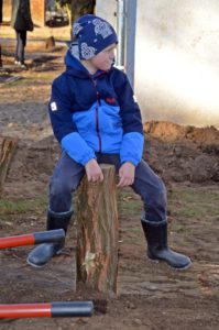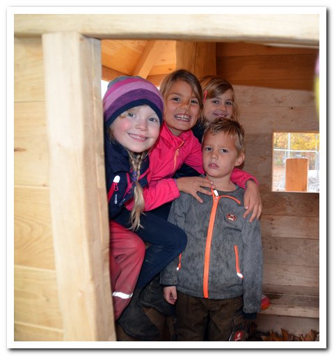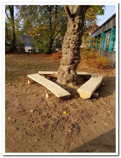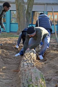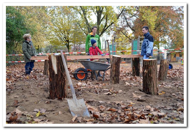 Heute in der Pause sind die Baumstämme, das neue Stelzenhaus und die Bänke schon intensiv von den Kindern eingeweiht worden.