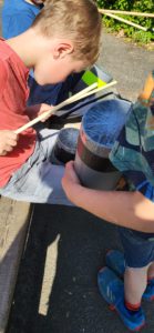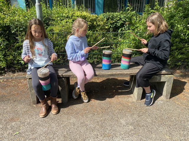 Das stellten die Pfoten/Klasse 1a eindrucksvoll unter Beweis, indem sie Punkte zeichneten, erste Erfahrungen mit Wasserfarbe sammelten, Methoden des Druckens kennen lernten, mit Aquarellkreide arbeiteten und am Ende alles zu einem großen Gesamtkunstwerk collagierten. Die Freude und der Stolz waren riesengroß, diese Werke dann als ihre erste Ausstellung in der Aula präsentieren zu dürfen.